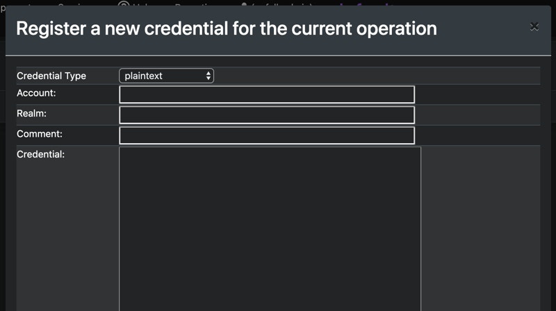 As part of command output, credentials can be registered automatically if the agent parses out the material. Otherwise, users can also manually register credentials. There are a few pieces of information required: