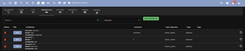 Command parameters can hook into this by having a parameter type ofCredentialJson - the tasking UI will get a dropdown for the various credentials to choose from and your create_go_tasking function will get a dictionary of all the credential’s information.