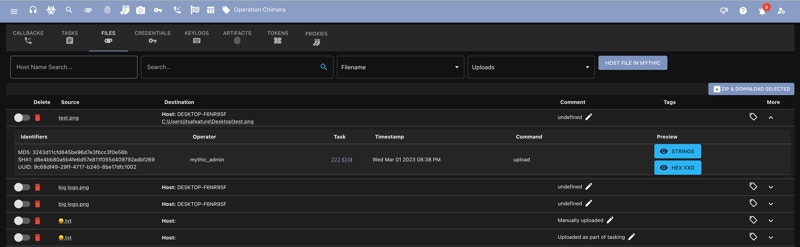 This page simply shows all uploads and downloads tracked by Mythic and breaks them up by task. From here, you can see who download or uploaded a file, when it happened, and where it went to or came from. Clicking the download button will download the file to the user’s machine. If you want to download multiple files at once from theDownloads section, click the toggle for all the files you want and select the Zip & Download selected button at the top right to download them. You can also preview the first 512KB of a file either as a string or as a hex xxd formatted view. This makes it easier to browse downloaded files without having to actually download them and open them up in a new tool.