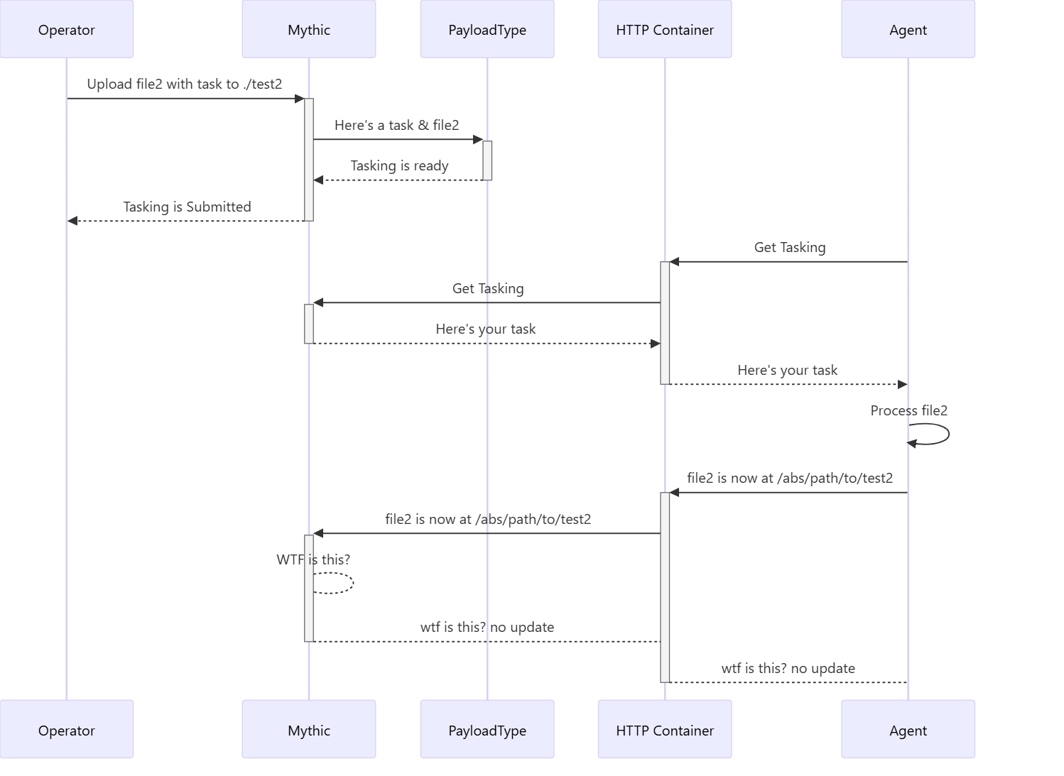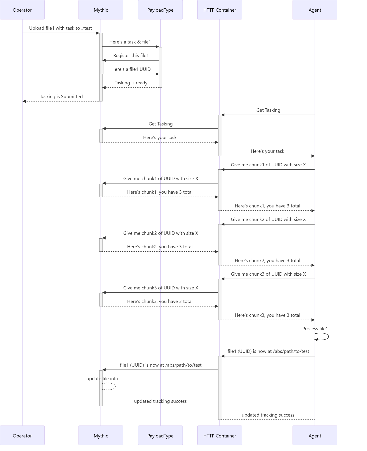 create_tasking function where it tracks and registers the file within Mythic. Now the tasking has a UUID for the file rather than the file contents itself. This allows Mythic and the Agent to uniquely reference a file. The agent gets tasking, sees the file id, and submits more requests to fetch the file. Upon finally getting the full file, it resolves the relative upload path into an absolute path and sends an update back to Mythic to let it know that the file the operator said to upload to ./test is actually at /abs/pah/to/test on the target host.