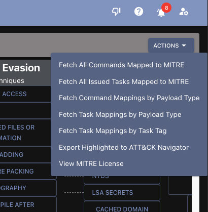 The “Fetch All Issued Tasks Mapped to MITRE” only shows this information for commands that have already been executed in the current operation. This shows what’s been done, rather than what’s possible. Clicking on a cell with this information loaded gives the exact task and command arguments that occurred with that task: